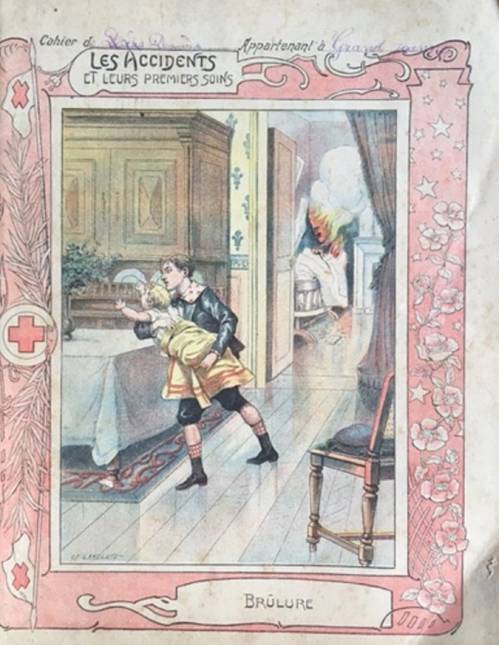 Cette série, " au titre complet Les accidents et leurs premiers soins, non numérotée et fort incomplète dans la collection et dont les illustrations sont de Gangloff, est une production de l’imprimeur-éditeur parisien Veuve Godchaux, à qui l’on doit toute une collection de couvertures de cahier, ainsi que l’édition de cahiers d’écriture (méthode).