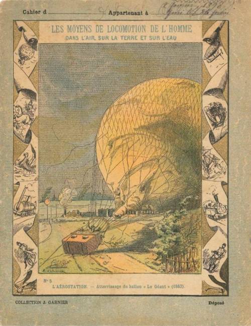 Couverture n° 5 : Atterrissage du ballon Le Géant en 1863. Chromolithographie sur papier épais couleur bleu. Belle frise noire avec tous les moyens de locomotion. Rehauts dorés. Au dos, texte explicatif signé Louis Chrétien.