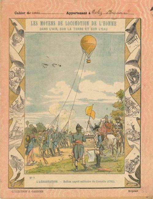Couverture n° 7 : Ballon captif militaire de Coutelle en 1793. Chromolithographie sur papier épais couleur rose. Belle frise noire avec tous les moyens de locomotion. Rehauts dorés…. Cahier de devoir appartenant à Arnaud Dollez. Au dos, texte explicatif signé Louis Chrétien.