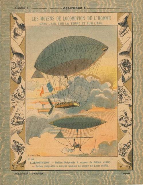 Couverture n° 10 : Ballon dirigeable à vapeur de Giffard/ ballon dirigeable à moteur humain de Dupuy du Lôme. Chromolithographie sur papier épais couleur bleu. Belle frise noire avec tous les moyens de locomotion. Rehauts dorés. Au dos, texte explicatif signé Louis Chrétien.