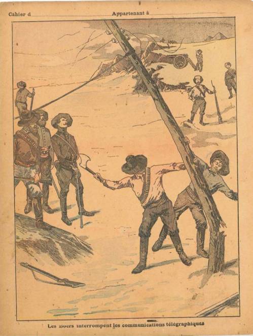 Couverture non numérotée : Les Boers interrompent les communications télégraphiques. Chromolithographie sur papier épais beige. Au dos, carte des états du Sud de l’Afrique.