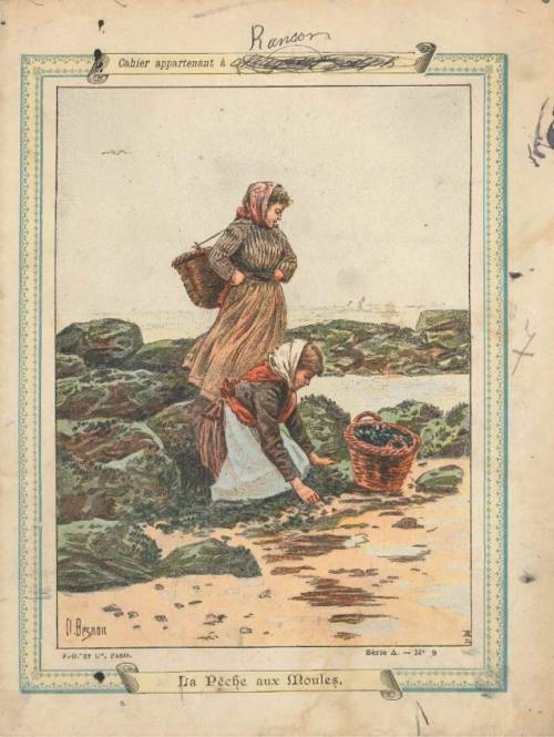 Couverture n° 9: La pêche aux moules. Chromolithographie sur papier épais beige. Fine frise rose…. Cahier appartenant à Ranson. Au dos, texte explicatif anonyme