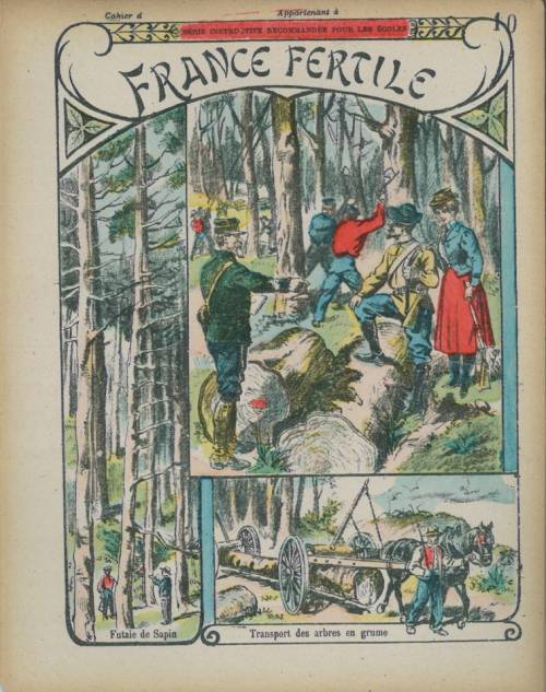 Couverture non numérotée : L’exploitation des forêts. Chromolithographie sur papier épais beige. Elégant frise et plusieurs saynètes légendées. Au dos, texte explicatif anonyme et gravure en n/b.