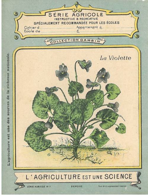Couverture n°7 : La violette. Chromolithographie sur papier épais. Tire et gravure dans encadrement jaune. Sous-titre en bas : « L’agriculture est une science ». Fond vert, avec frise fleuri et paysagère. Au dos, texte, dans fine frise noire explicatif signé Victor Bourgey.