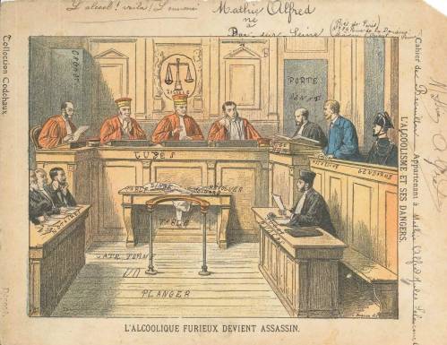 Couverture non numérotée : L’alcoolique furieux devient assassin. Chromolithographie sur papier beige épais…. Cahier de brouillon de Mathie Lelencourt. Au dos, texte explicatif signé Léon Gérardin.