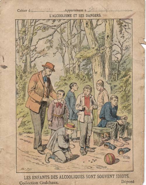 Couverture non numérotée : Les enfants des alcooliques sont souvent idiots. Chromolithographie sur papier beige épais… cahier de devoir appartenant à Joseph (illisible). Au dos, texte explicatif signé Léon Gérardin.