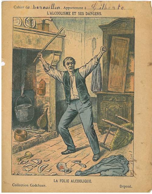 Couverture non numérotée : La folie alcoolique. Chromolithographie sur papier beige épais… cahier de brouillon appartenant à Gilberte. Au dos, texte explicatif signé Léon Gérardin