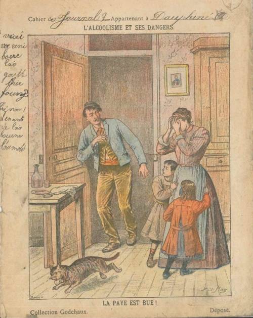 Couverture non numérotée : La paie est bue. Chromolithographie sur papier beige épais. Cahier-journal appartenant à A. Dauphiné. Au dos, texte explicatif signé Léon Gérardin.