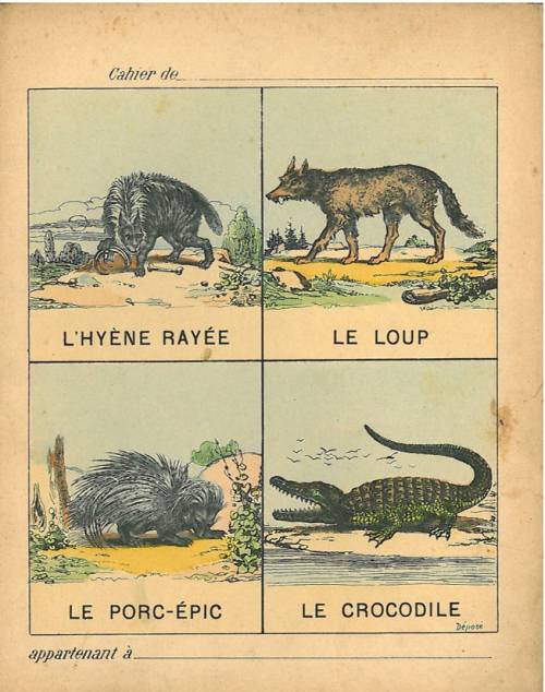 Couverture non numérotée : Hyène / Loup/ Crocodile / Porc-épic. Chromolithographie sur papier épais beige. Au dos, 4 petits textes explicatifs anonymes.
