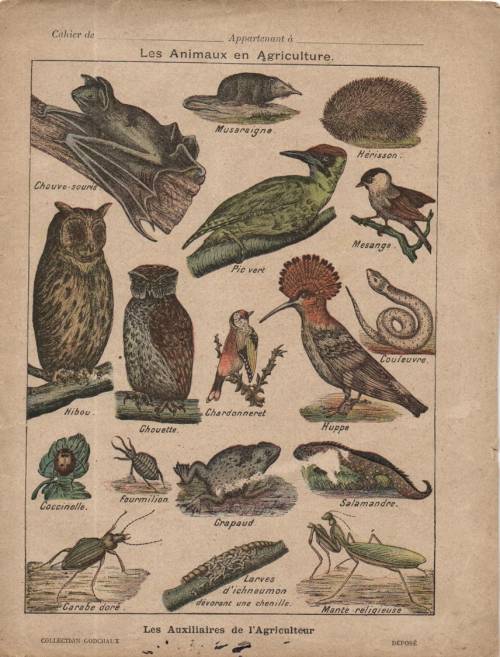 Couverture non numérotée : Les insectes nuisibles en agriculture. Chromolithographie sur papier épais beige. Au dos, texte explicatif anonyme.