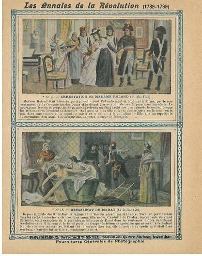 Couverture avec illustrations 17 et 18 : Arrestation de madame Roland / Assassinat de Marat. Chromolithographie, sur papier épais beige. Frise bleue, deux scènes légendées. Au dos, tableau de multiplication;