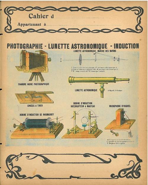 Couverture non numérotée : Photographie / Lunette astronomique / Induction. Chromolithographie sur papier épais. Au dos, texte explicatif anonyme en deux colonnes.