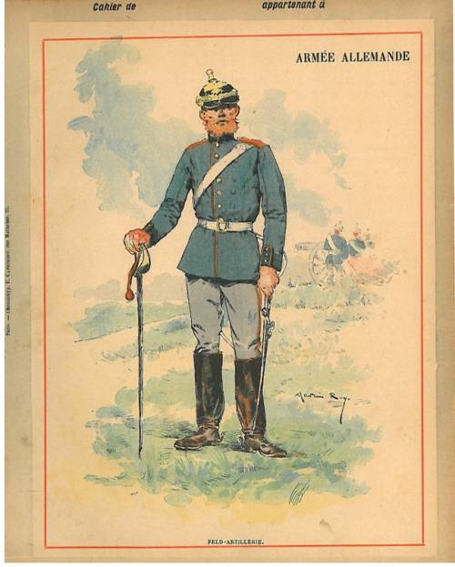 Couverture non numérotée : Feld-Artillerie. Chromolithographie sur papier épais beige. En pages intérieures, texte explicatif signé A.Dally et carte de l’Allemagne. Au dos, gravure en n/b de Roy (sergent-major communiquant les ordres à son capitaine).