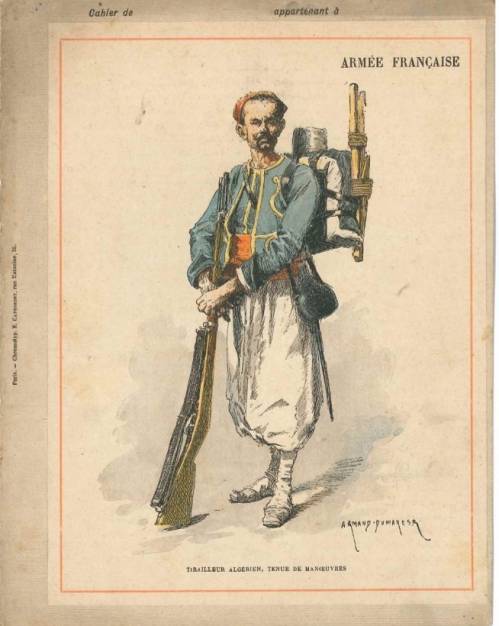 Couverture non numérotée : Tirailleur algérien en tenue de manœuvres. Chromolithographie sur papier épais beige. En pages intérieures, explication sur les quatre armes de combat et carte de France. Au dos, gravure de Chaperon (tir au revolver).
