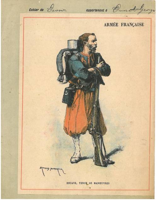 Couverture non numérotée : Zouave en tenue de manœuvres. Chromolithographie sur papier épais beige. En pages intérieures, explication sur les quatre armes de combat et carte de France. Au dos, gravure de Chaperon (le concert).