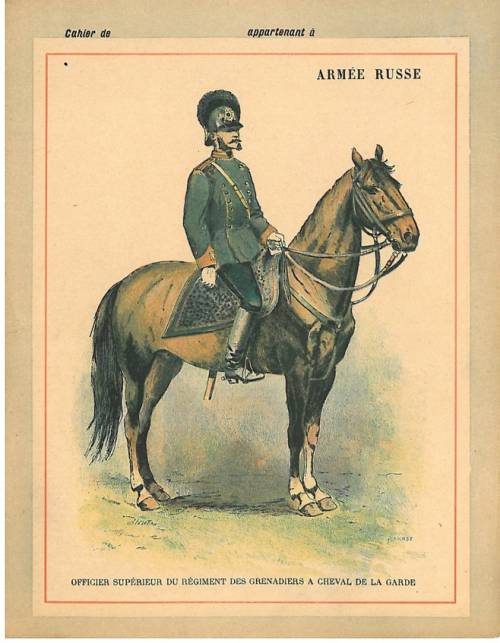 Couverture non numérotée : Officier supérieur du régiment des grenadiers à cheval de la garde. Chromolithographie sur papier épais beige. En pages intérieures, texte explicatif signé A. Dally (lieutenant-colonel Aristide Dailly) et carte de la Russie. Au dos, gravure en n/b de Myrbach (cosaque de l’Amour, tenue de campagne).