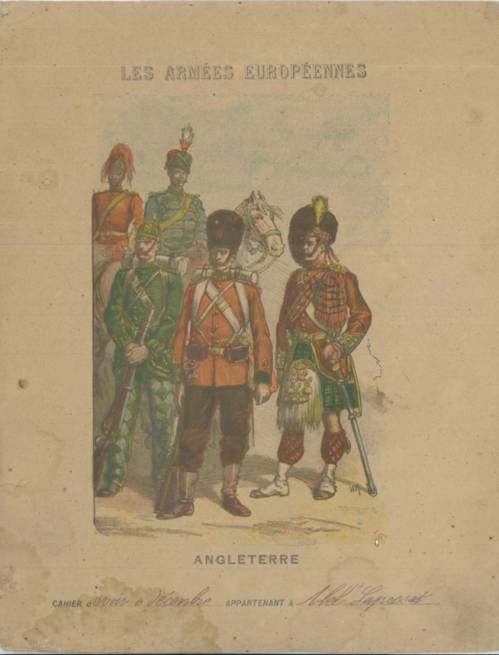 Couverture non numérotée : Angleterre. Chromolithographie sur papier épais beige… cahier de devoir appartenant à Abel Lapessat. En pages intérieures et au dos, textes explicatifs anonymes et tableaux.