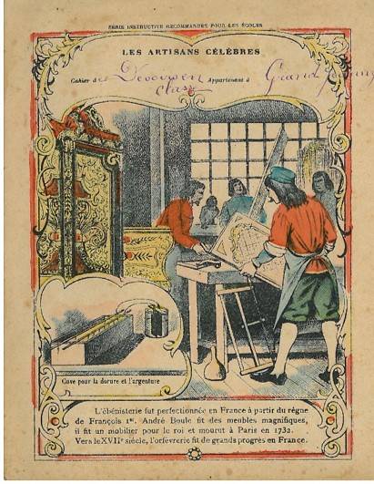 Couverture n° 10 :Ebènisterie / Boule.. Chromolithographie sur papier épais beige… cahier de devoir en classe appartenant à Joanny Grand. Au dos, texte explicatif anonyme.