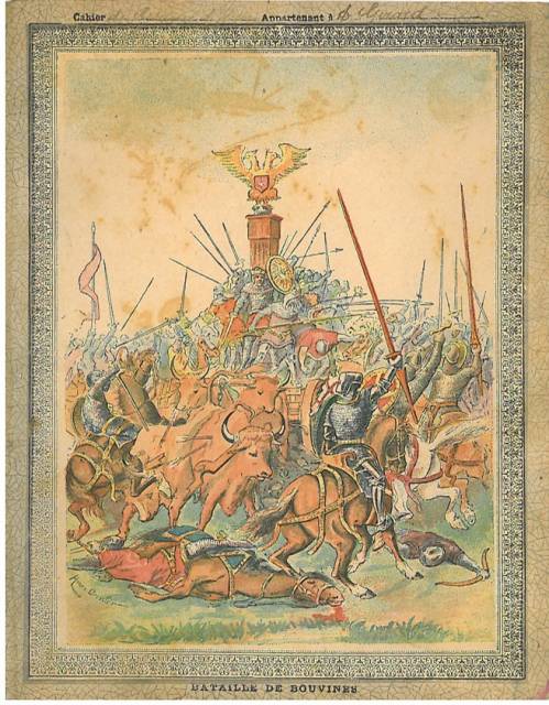 Couverture non numérotée : Bataille de Bouvines. Chromolithographie sur papier épais beige. Fond rose et fine frise grise. Au dos, texte explicatif signé Désiré Lacroix.