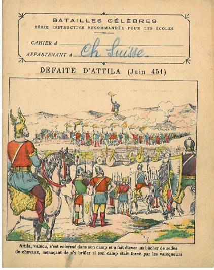 Couverture non numérotée : Défaite d’Attila (Juin 451). Chromolithographie sur papier beige épais. Au dos, texte explicatif anonyme.