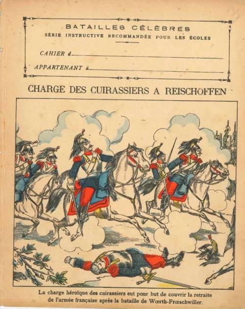 Couverture non numérotée : Charge des cuirassiers à Reischoffen. Chromolithographie sur papier beige épais. Au dos, texte explicatif anonyme.