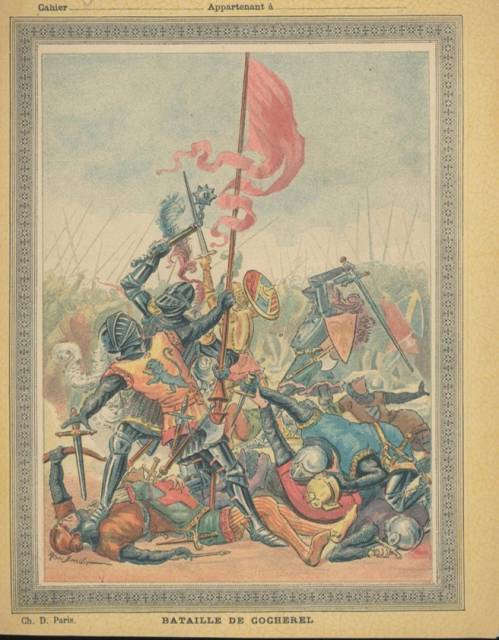 Couverture non numérotée : Bataille de Cocherel. Chromolithographie sur papier épais beige. Fond bleu-gris et fine frise grise. Au dos, texte explicatif signé Désiré Lacroix.