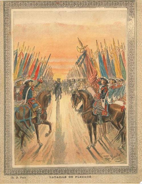 Couverture non numérotée : Bataille de Fleurus. Chromolithographie sur papier épais beige. Fond bleu-gris et fine frise grise. Au dos, texte explicatif signé Désiré Lacroix.