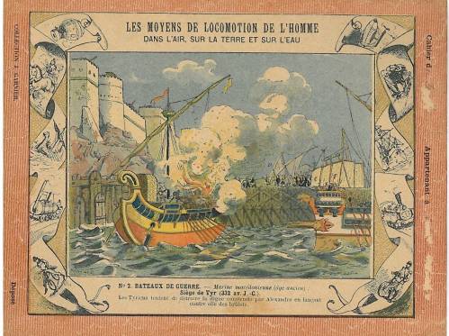 Couverture n° 2 : Marine macédonienne / Siège de Tyr. Chromolithographie avec cadre historié en n&b (divers moyens de transport) sur fond bleu-vert… cahier de brouillon appartenant à Thibaut. Au dos, texte explicatif signé Louis Chrétien.
