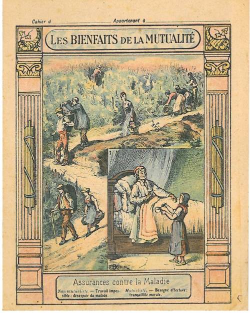 Couverture non numérotée : Assurances contre la maladie Chromolithographie sur papier épais beige ; Frise élaborée (colonnes avec à plat marbré). 2 saynètes. Au dos, texte extrait de Mutualité agricole, de F. Deliège