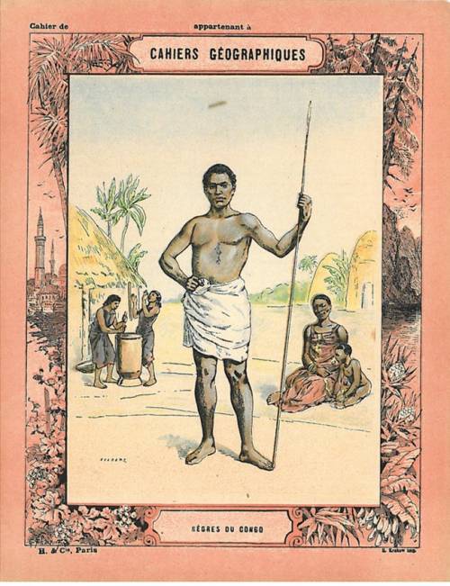 Couverture non numérotée : Nègres du Congo. Chromolithographie sur papier épais fond rouge, avec frise florale. En pages intérieures, explication tirée du livre de Ch. Delon, Les peuples de la Terre, et notions géographiques. Au dos, carte de l’Afrique et questionnaire tiré du Cours général de Géographie de Lemonnier et Schrader.