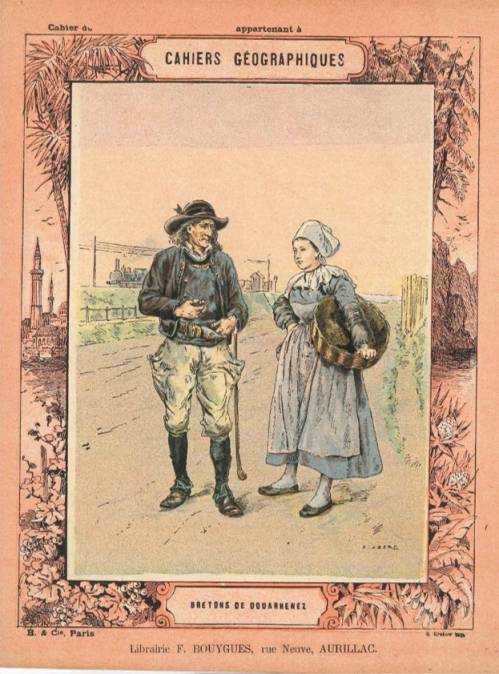 Couverture non numérotée : Bretons de Douardenez. Chromolithographie sur papier épais fond bleu, avec frise florale. En pages intérieures, explication tirée du livre de Ch. Delon, Les peuples de la Terre, et notions géographiques. Au dos, carte des chemins de fer français.