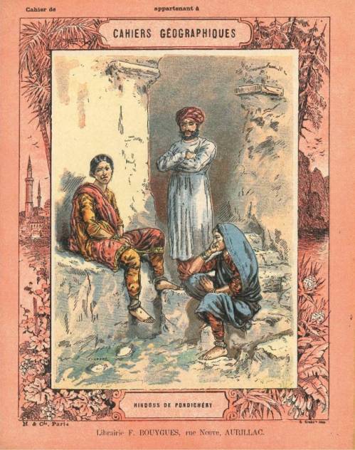 Couverture non numérotée : Hindous de Pondichéry. Chromolithographie sur papier épais fond rose, avec frise florale. En pages intérieures, explication tirée du livre de Ch. Delon, Les peuples de la Terre, et notions géographiques. Au dos, carte des colonies françaises, questionnaire tiré du Cours général de Géographie de Lemonnier et Schrader.