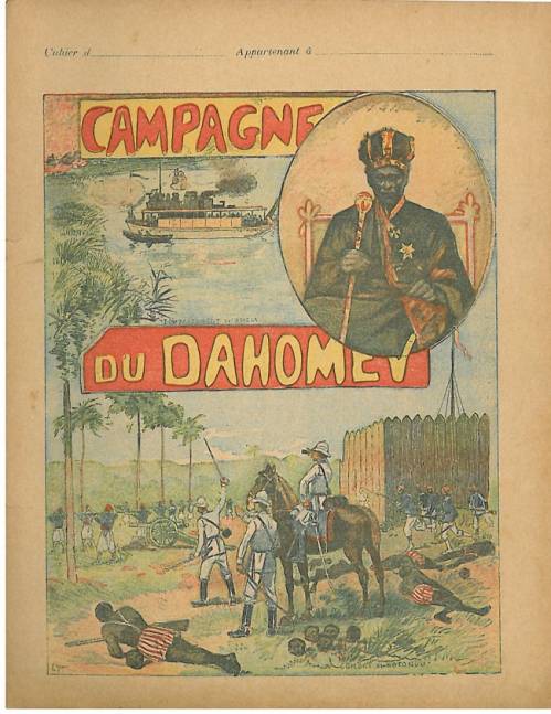Couverture non numérotée : Bombardement de Doyella / Le roi Toffa / Le combat de Kotonou. Chromolithographie sur papier épais beige. Au dos, textes explicatifs anonymes.