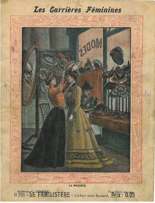 Couverture non numérotée : la modiste. Chromolithographie avec frise style Art déco. Au dos, texte explicatif signé Er. Richa, anagramme de Charier.