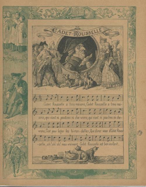 Couverture non numérotée : Cadet Roussel (gravure et partition). Chromolithographie sur papier épais beige. Bichromie. Frise avec saynètes de musique. Au dos, paroles de la chanson.