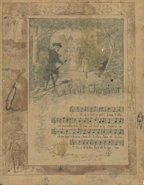 Couverture non numérotée : Le petit chasseur (gravure et partition). Chromolithographie sur papier épais beige. Bichromie. Frise avec saynètes de musique. Au dos, paroles de la chanson.
