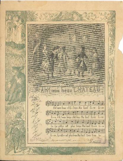 Couverture non numérotée : Ah, mon beau château (gravure et partition). Chromolithographie sur papier épais beige. Bichromie. Frise avec saynètes de musique. Au dos, paroles de la chanson.