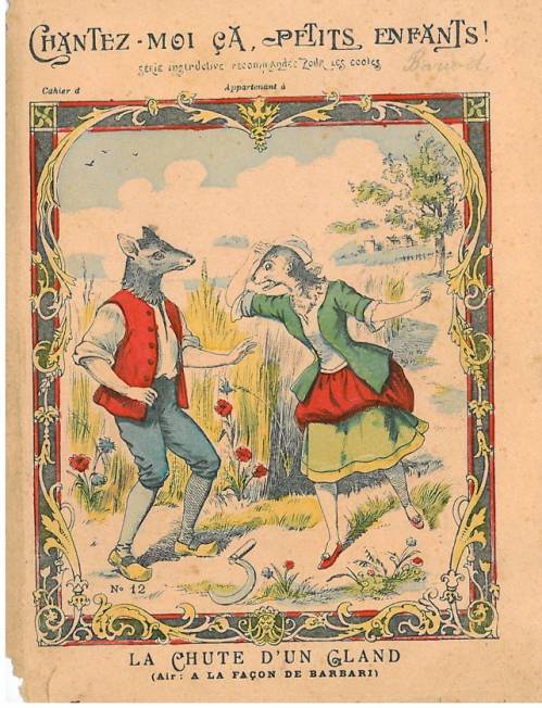 Couverture n° 12 : La chute d’un gland (Air : il était une bergère). Chromolithographie sur papier épais beige. Frise élégante Art déco. Au dos, texte de la fable. Adaptation de François Praz.