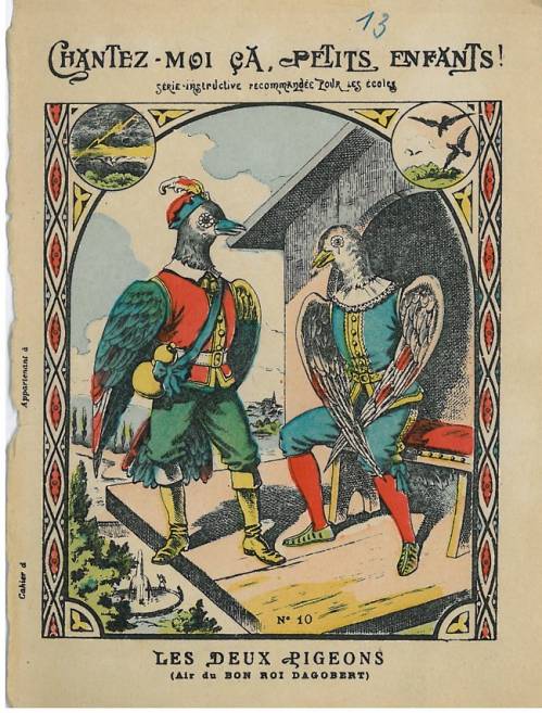 Couverture n° 10 : Les deux pigeons (Air du bon roi Dagobert). Chromolithographie sur papier épais beige. Frise élégante Art déco. Dos arraché.