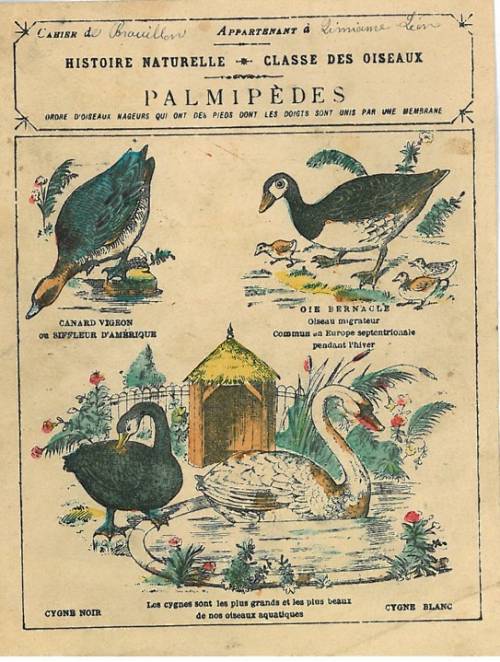 Couverture non numérotée : Classe des oiseaux / Palmipèdes. Chromolithographie sur papier épais beige… cahier de brouillon appartenant à Léon (illisible). Dos arraché.