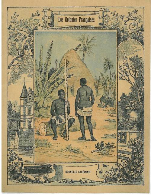 Couverture non numérotée : Nouvelle-Calédonie. Encadrement avec drapeau, en n/b. Chromolithographie sur papier épais beige, avec frise paysagère. Au dos, texte explicatif anonyme.