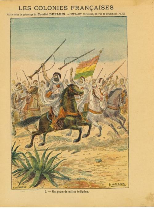 Couverture n°5 : Un goum de milice indigène. Chromolithographie sur papier épais. .En pages intérieures, suite du texte sur la géographie générale de l’Algérie. Au dos, cliché : la place d’armes de Blidah.