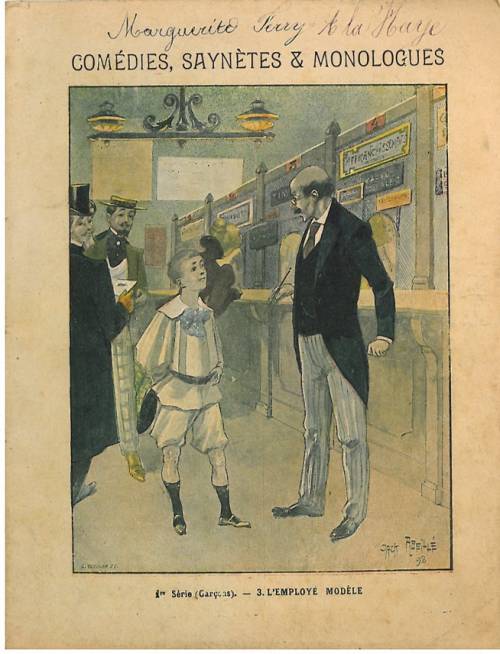 Cette série,au titre complet Comédies, saynètes et monologues, numérotée et incomplète dans la collection, est éditée par les papeteries des Châtelles ; Son directeur, Louis Geisler (1852-1014) reprend l’usine familiale de pâte à papier en 1881. Illustrateur, inventeur de la trichromophotogravure et d’une machine de fabrication de cahier, il développe l’entreprise et ouvre une succursale à Paris Il y crée un atelier de photographie et de phototypie qui attire les affichistes et les directeurs de presse. A noter une autre série, à l’attention des filles.