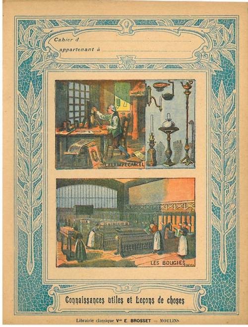 Couverture non numérotée : La lampe Carcel / Les bougies. Jolie frise bleue. Chromolithographie sur papier épais beige. Bichromie. Au dos, texte sous forme de dialogue entre un père et son fils, Pierre.