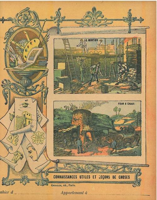 Couverture non numérotée : Le mortier / Le four à chaux. Jolie frise ornementée.. Chromolithographie sur papier épais beige. Au dos, deux textes explicatifs, anonymes et très pédagogiques.