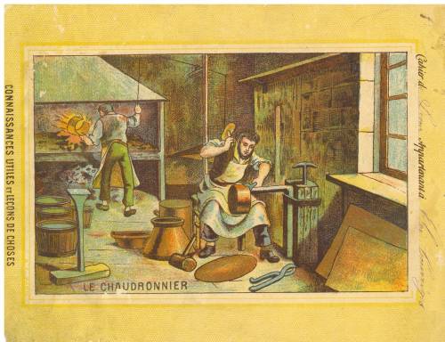 Couverture non numérotée : Chaudronnier. Chromolithographie sur papier épais beige. Fond jaune… cahier de devoir appartenant à Eloi Courrèges. Au dos, texte explicatif anonyme, en deux colonnes.