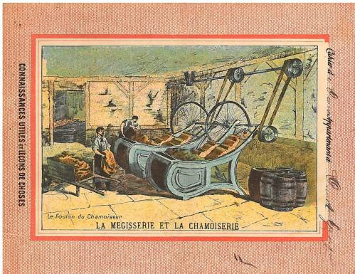 Couverture non numérotée : Mégisserie et chamoiserie. Chromolithographie sur papier épais beige. Fond rose… cahier de devoir appartenant à Georges Dunet. Au dos, texte explicatif anonyme, en deux colonnes.