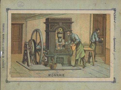 Couverture non numérotée : La monnaie. Chromolithographie sur papier épais beige. Fond bleu-gris. Au dos, texte explicatif anonyme, en deux colonnes.