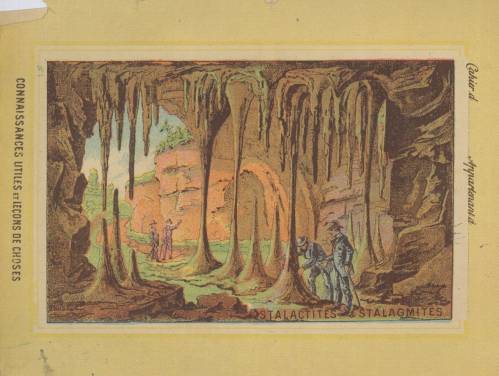 Couverture non numérotée : Stalactites et stalacmites. Chromolithographie sur papier épais beige. Fond jaune. Au dos, texte explicatif anonyme, en deux colonnes.