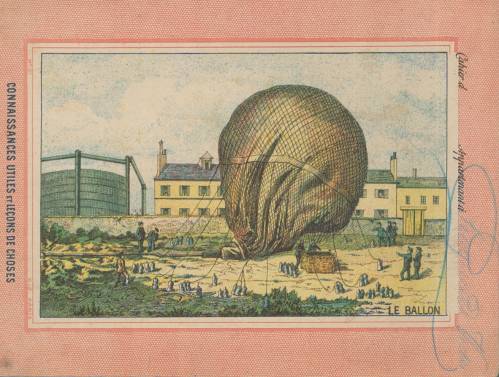 Couverture non numérotée : Le ballon. Chromolithographie sur papier épais beige. Fond rose. Au dos, texte explicatif anonyme, en deux colonnes.